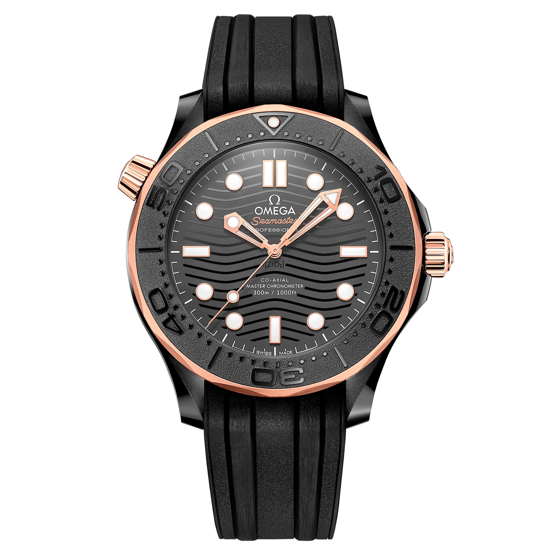 This 43.50mm model, cased in black ceramic [ZrO2] and Sedna™ gold, has a black ceramic dial with laser-ablated waves in positive relief. The polished Sedna™ gold indexes and facetted hands, filled with white Super-LumiNova, contrast beautifully with the black dial. Completing the look is an integrated black rubber strap with black ceramic buckle.