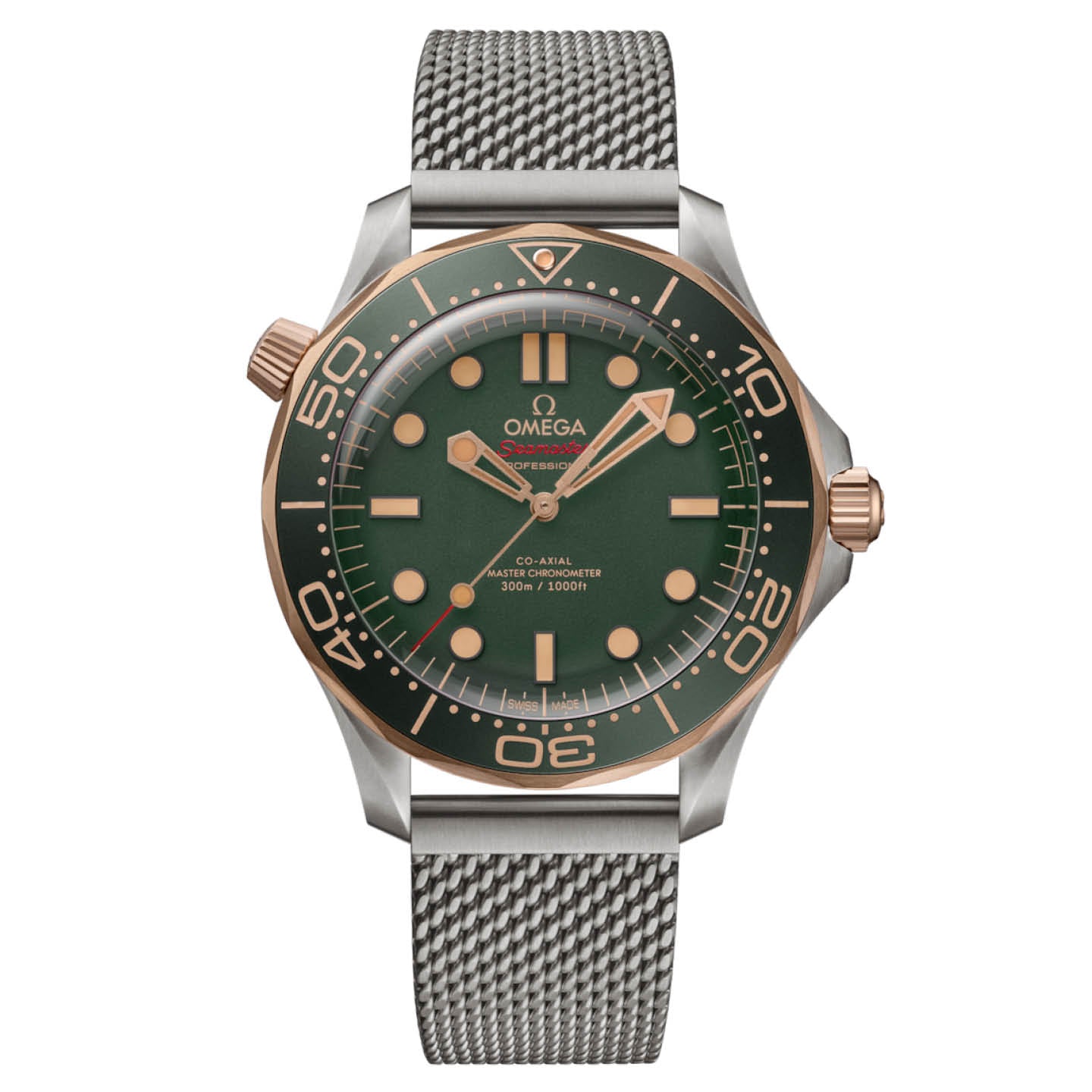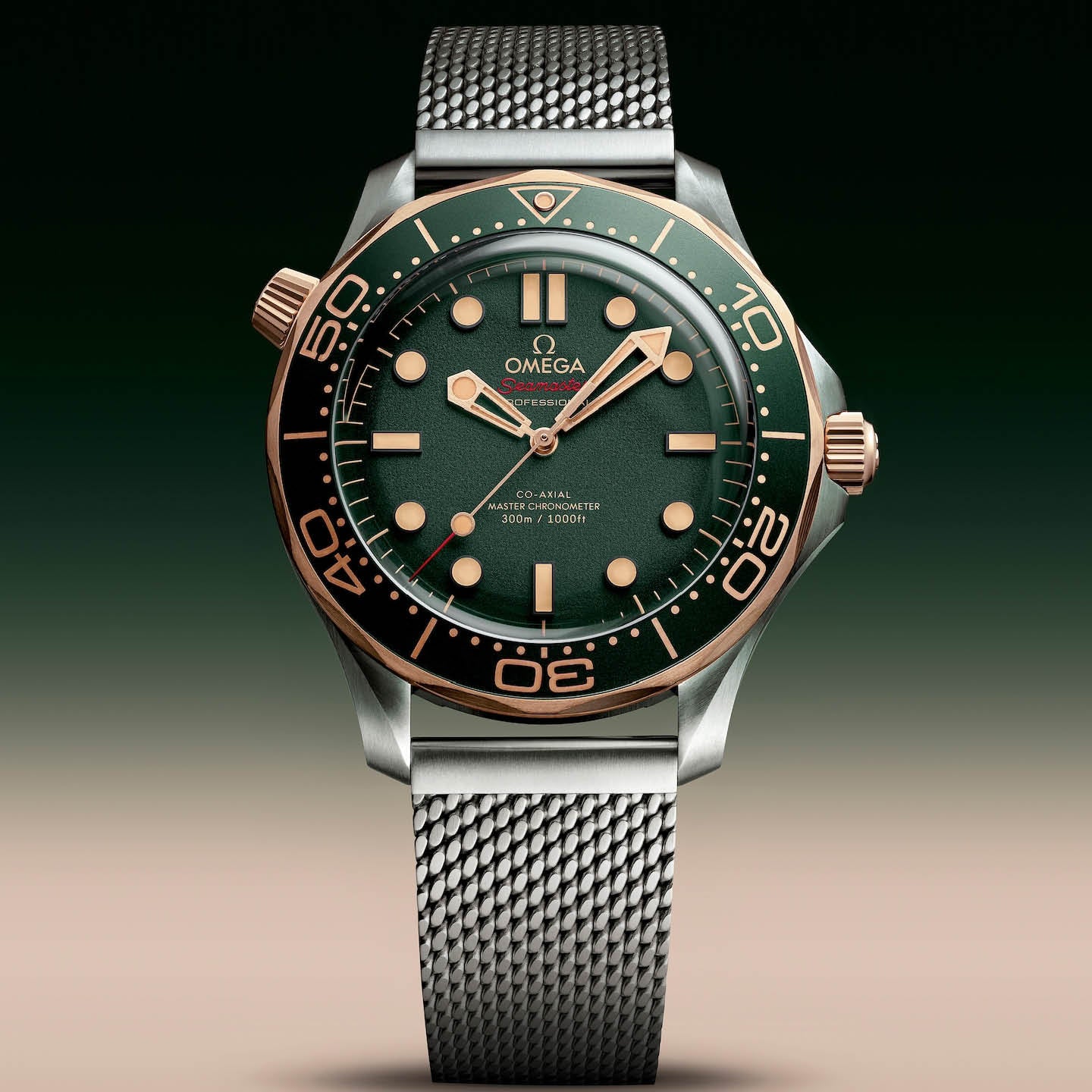 This 42 mm model is crafted in grade 2 titanium and OMEGA’s exclusive 9K Bronze Gold. It includes a green oxalic anodized aluminium bezel ring with a diving scale in vintage Super-LumiNova.