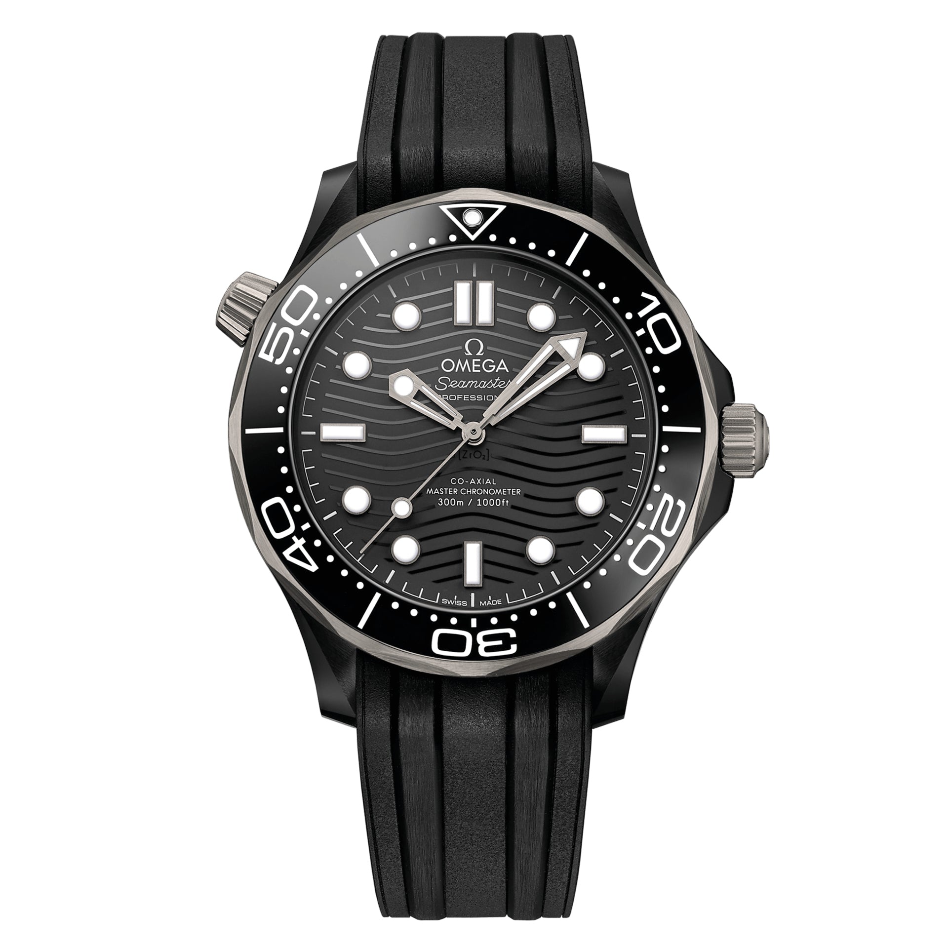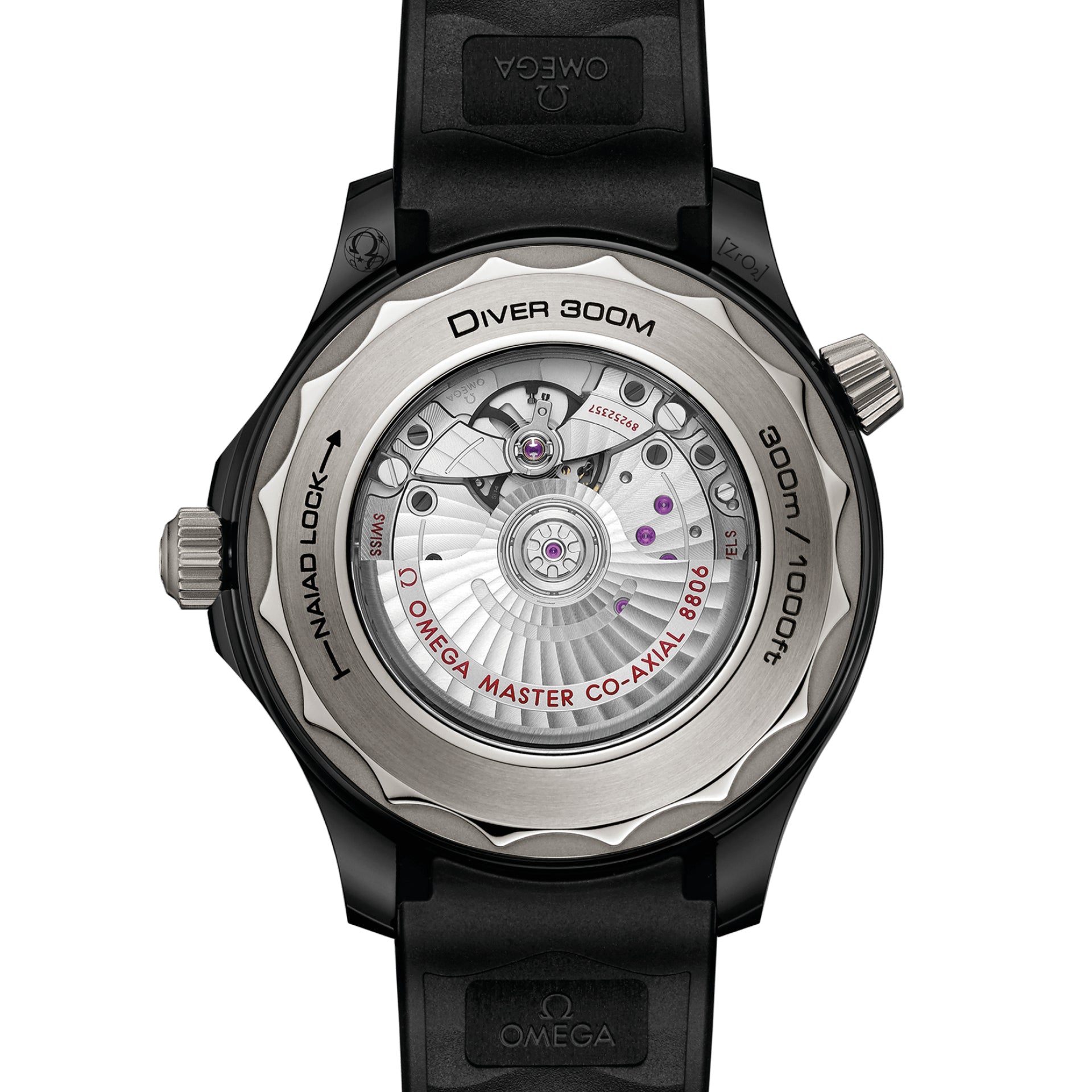 The watch is presented on an integrated black rubber strap with a polished-brushed black ceramic [ZrO2] buckle, and is driven by the OMEGA Master Chronometer Calibre 8806, which can be seen through the sapphire-crystal on the wave-edged caseback.
