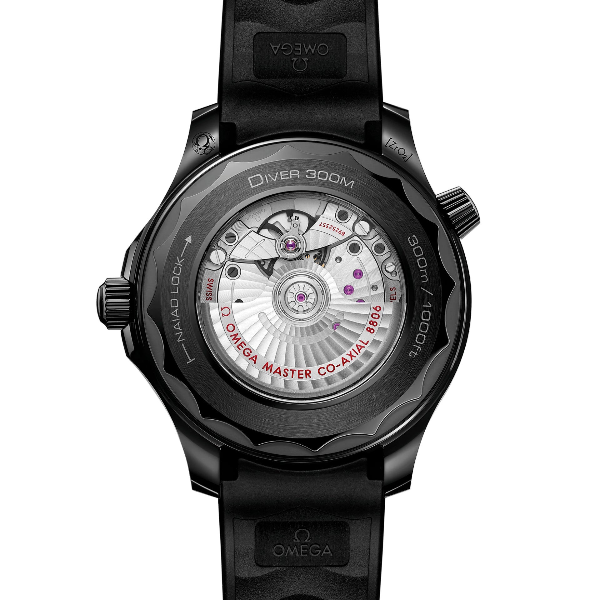 Completing the look is an integrated black rubber strap with black ceramic buckle. Adding some light to the darkness is a window with a clear view of the movement. Visible through the sapphire-crystal on the wave-edged caseback is OMEGA’s Co-Axial Master Chronometer Calibre 8806.