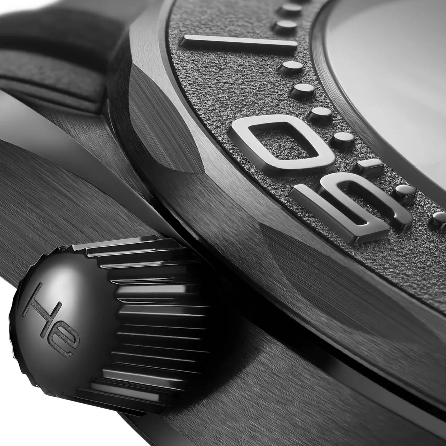 On this 43.50 mm model, black ceramic [ZrO2] dominates. The case, bezel, wave-pattern dial, crown and helium escape valve, all in the same striking material, give the watch a very distinctive, uniform and sculptural look. To ensure visibility without affecting the overall aesthetic, OMEGA has introduced anthracite Super-LumiNova to the diving scale, the black PVD indexes and skeleton hands - and dot at 12H.