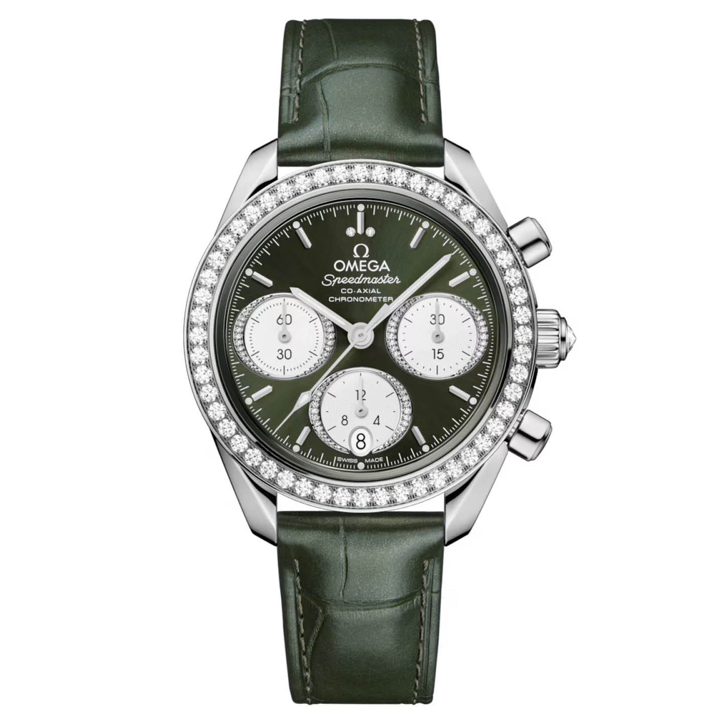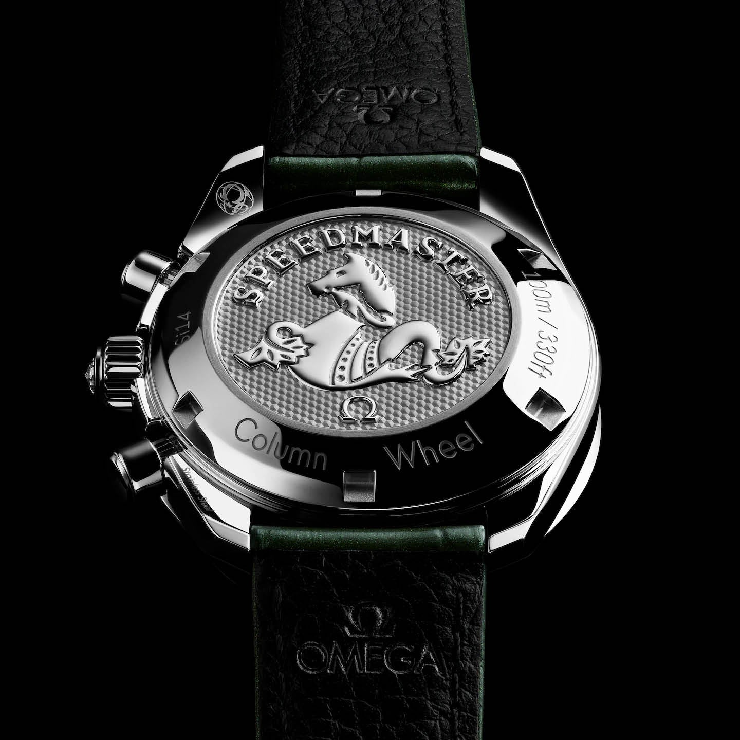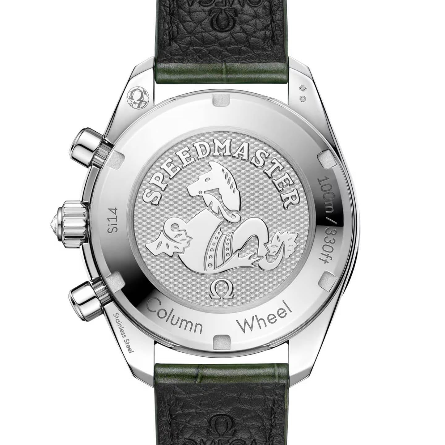 The watch has a green leather strap with stainless steel foldover clasp buckle. Its screw-in caseback is stamped with a Seahorse medallion. Providing the power is the OMEGA Co-Axial Calibre 3330.