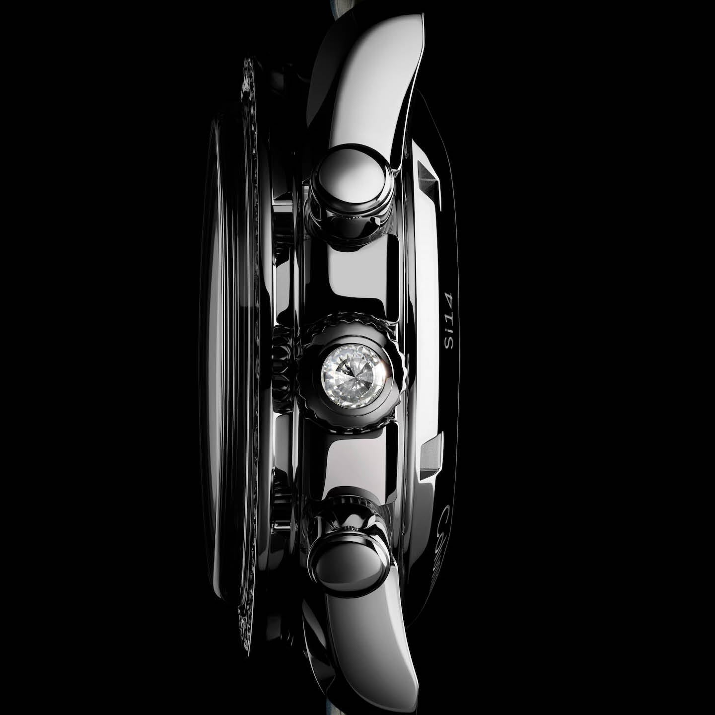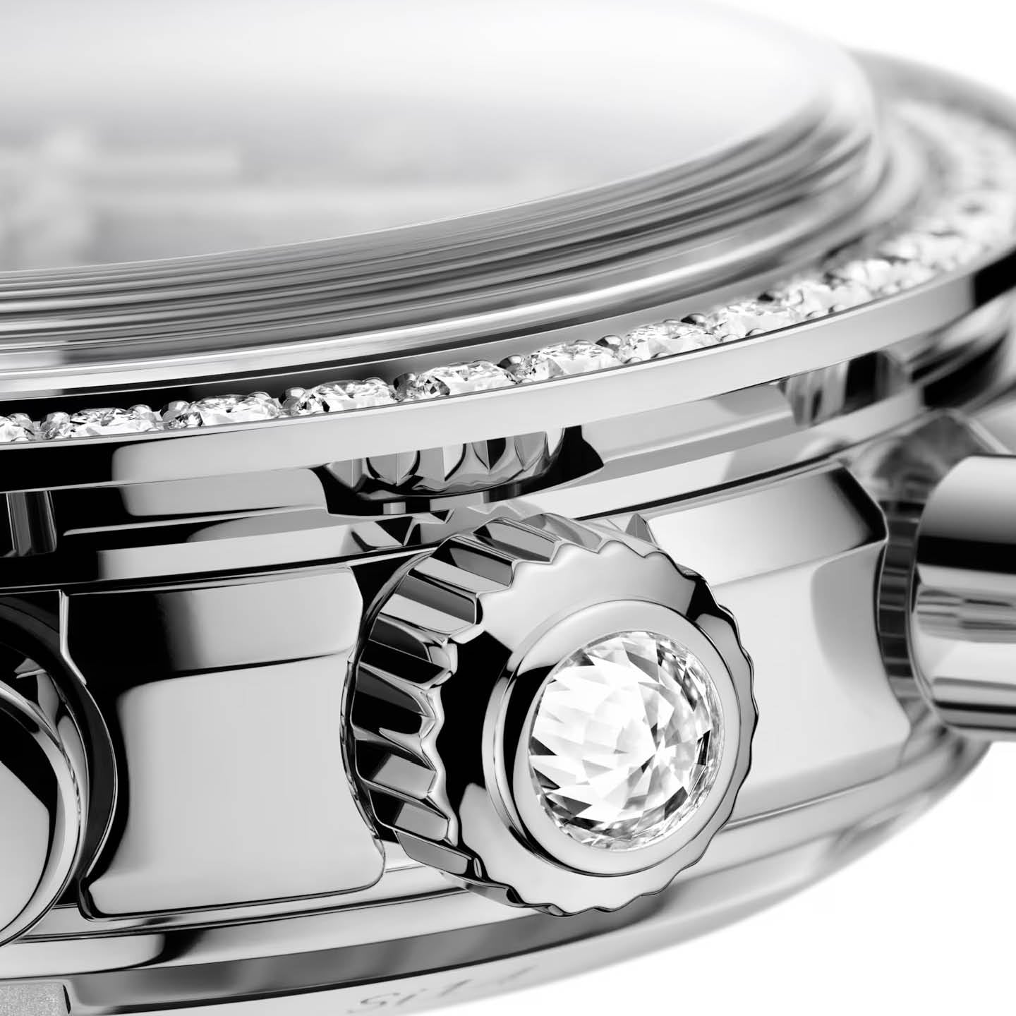 This model, cased in fully polished stainless steel, has a bezel set with 52 diamonds, and a polished crown set with a single diamond.