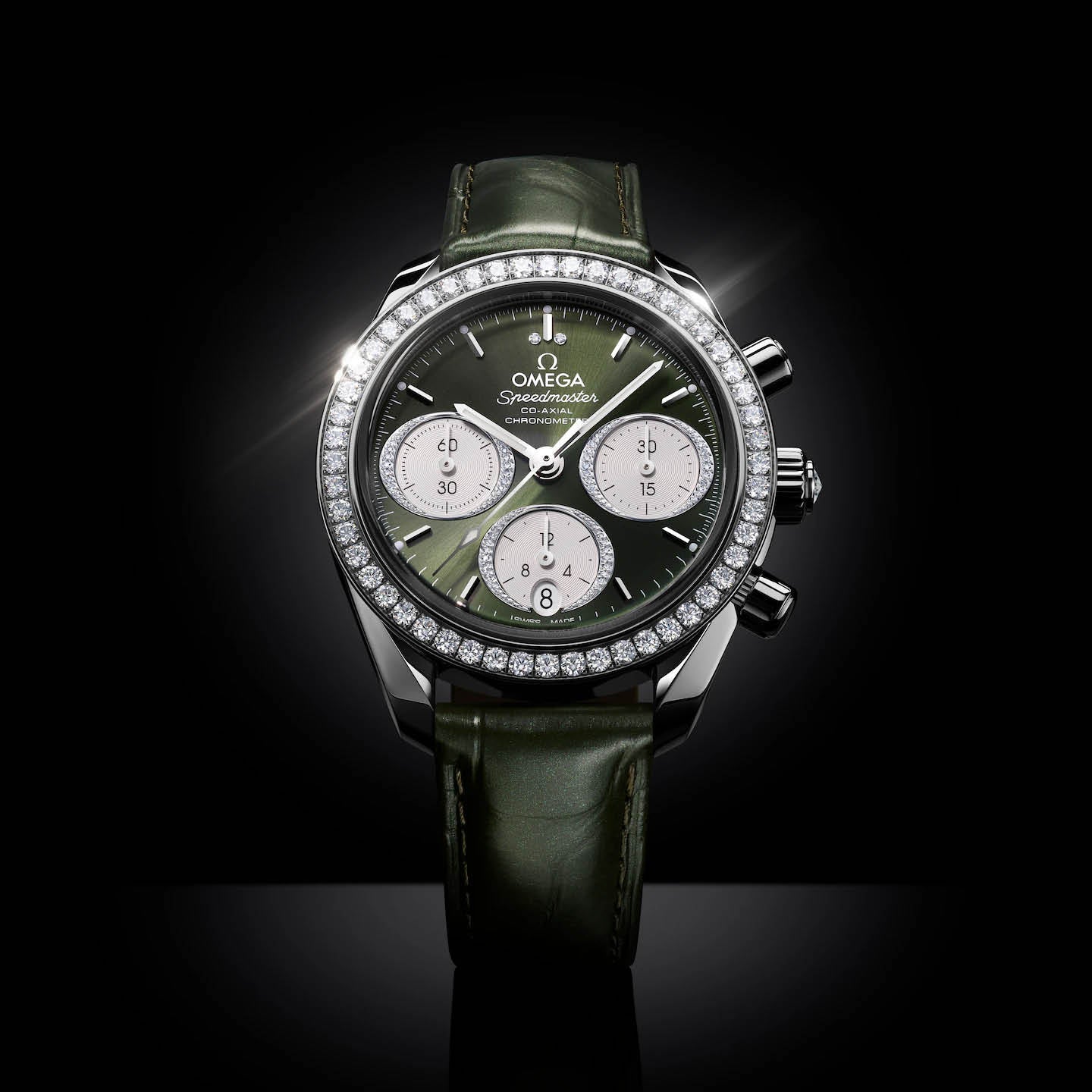 The green PVD dial includes horizontal oval subdials with silvery coating and a vertical oval date window at 6 o’clock. The hour/minute hands are diamond-polished rhodium-plated and filled with white Super-LumiNova which emits a green glow.