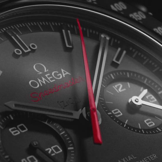 The hands and bevelled indexes are blackened and filled with black Super-LumiNova that glows green in the dark, while the red varnished central chronograph hand adds a striking contrast. Through the caseback, the manual-winding OMEGA Co-Axial Master Chronometer Calibre 9908 is visible, finished in a special “black edition” treatment with a matte-black rotor, bridges, and black-varnished engravings.