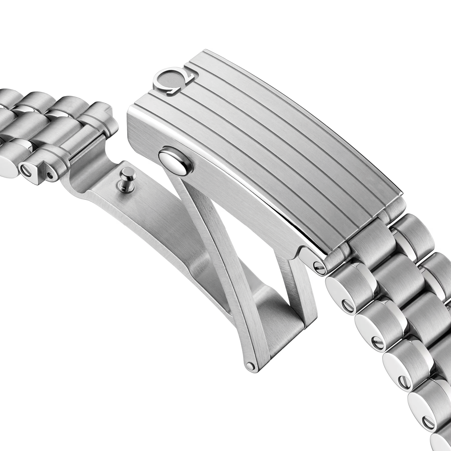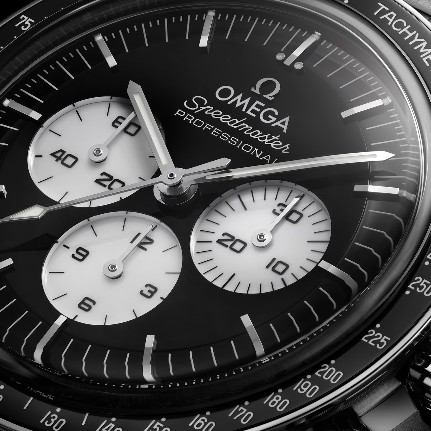 This 42 mm model features sapphire crystal glass on both the front and caseback, presented on a polished-brushed stainless steel bracelet. The design draws inspiration from the 4th generation Speedmaster worn on the moon. Its black varnished and lacquered double plate step dial is complemented by white varnished and lacquered subdials set within rhodium-plated frames. Details include the OMEGA logo and indexes, Moonwatch style hands, and the famous dot over 90 on the black ceramic bezel ring.