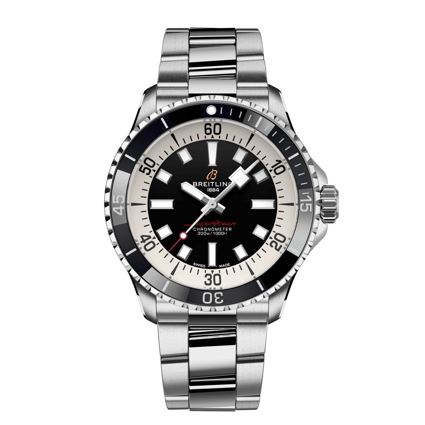 Aside from looking good, the new Superocean is also a technical marvel. Broad hands and indexes coated in luminescent Super-LumiNova® allow for superior readability underwater. At 300 m (1000 ft] water resistance, this watch triples the minimum requirement for dive watches. The two strap options (rubber and metal bracelet] have a folding clasp that allows for micro-adjustments of up to 15 mm for easy wear over rashies and dive suits. Its scratch-proof ceramic-inlaid bezel means it will never wear or fade. For safety, the bezel is uni-directional on most sizes and bi-directional with a patented lock on the 46 mm. This watch is also shock-, sand- and saltwater-resistant. It's automatic Breitling Caliber 17 comes with a two-year warranty and approximate 38-hour power reserve.