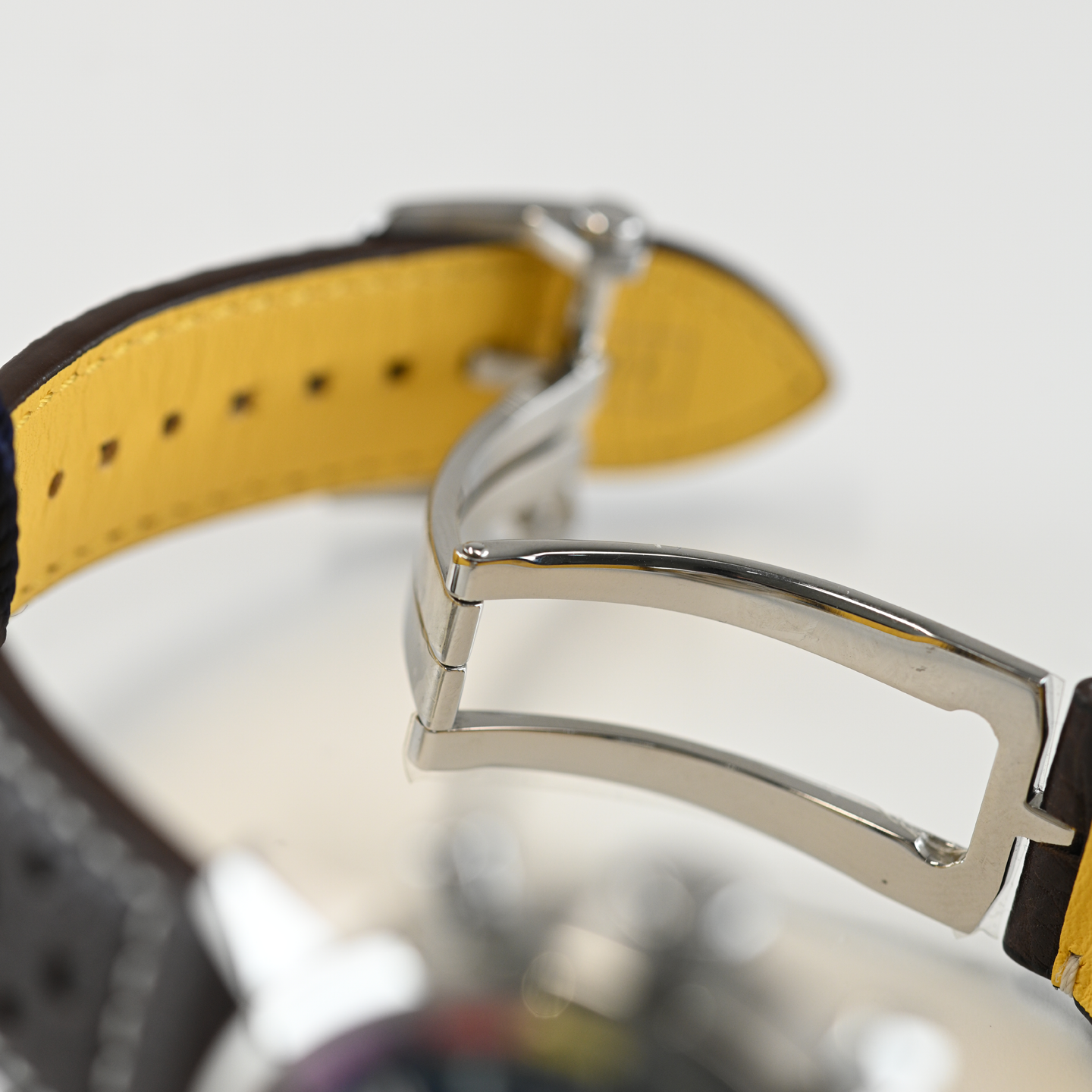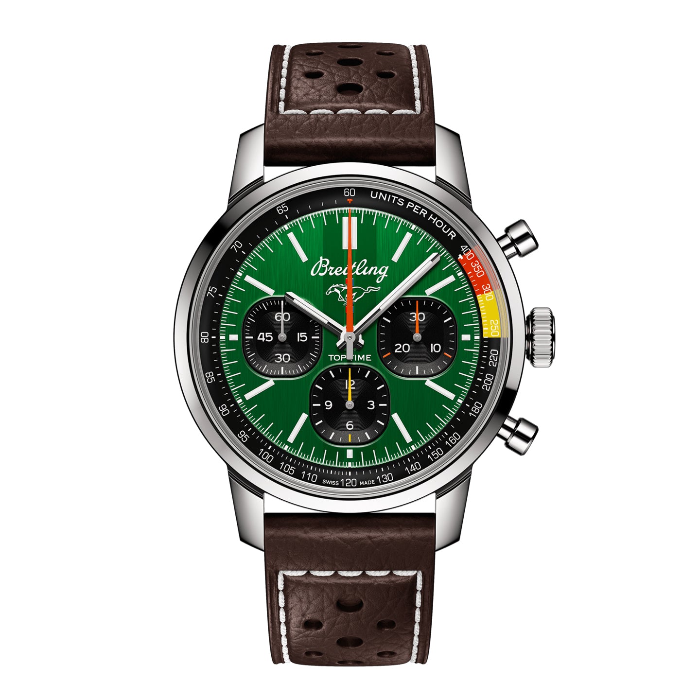 The first-generation Ford Mustang, produced from 1964 to 1974, became the car of choice for hitting the road in hip 1960s America. This living legend is still in production, but car buffs know that the coolest of all were those very first models that captured the freewheeling spirit of the sixties. The Top Time B01 Ford Mustang features the colors and emblem of its classic-car counterpart as well as a perforated leather racing strap, speed-measuring tachymeter scale and contrasting “squircle” (not quite square, not quite round) subdials that give the feel of vintage dashboard gauges. It also comes with a brag-worthy engine under the hood: the exceptional Breitling Manufacture Caliber 01.