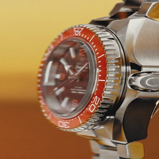 Crafted in polished-brushed stainless steel, the case frames a polished orange ceramic bezel with a white hybrid-ceramic diving scale and a polished grade 5 titanium inner ring. The matte black dial keeps the look clean and purposeful, with rhodium-plated hands and indexes filled with white Super-LumiNova for clarity in all conditions. Four Arabic numerals in orange add a subtle, sporty contrast.